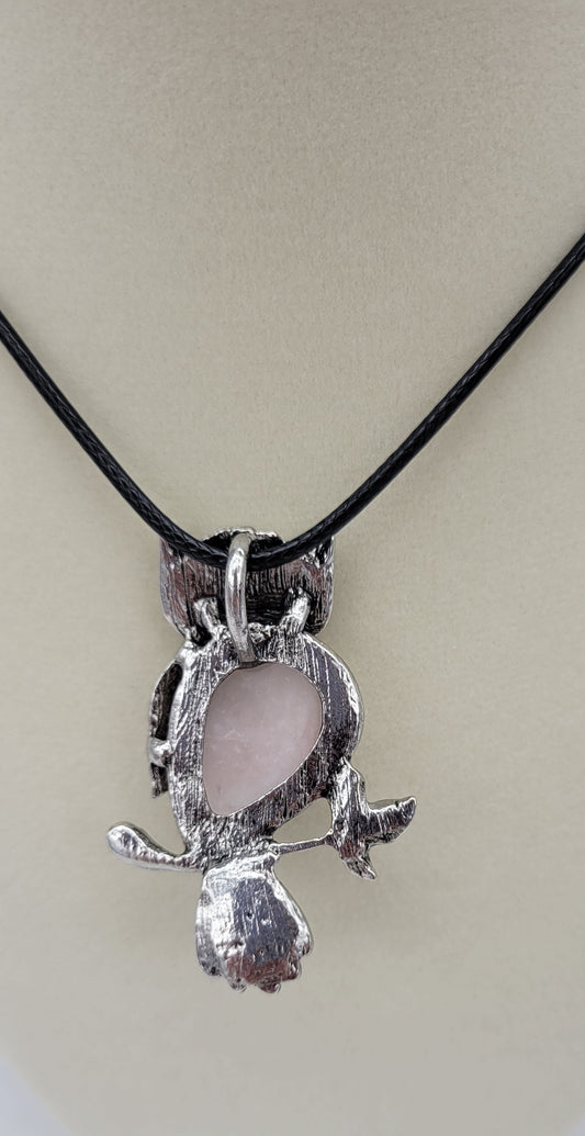 Owl Charm Pendant Necklace with Inlaid Rose Quartz Stone