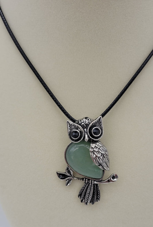 Owl Charm Pendant Necklace with Inlaid Aventurine Stone