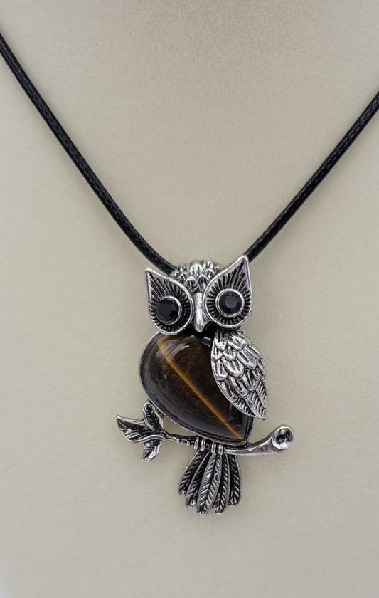 Owl Charm Pendant Necklace with Inlaid Tiger Eye Stone